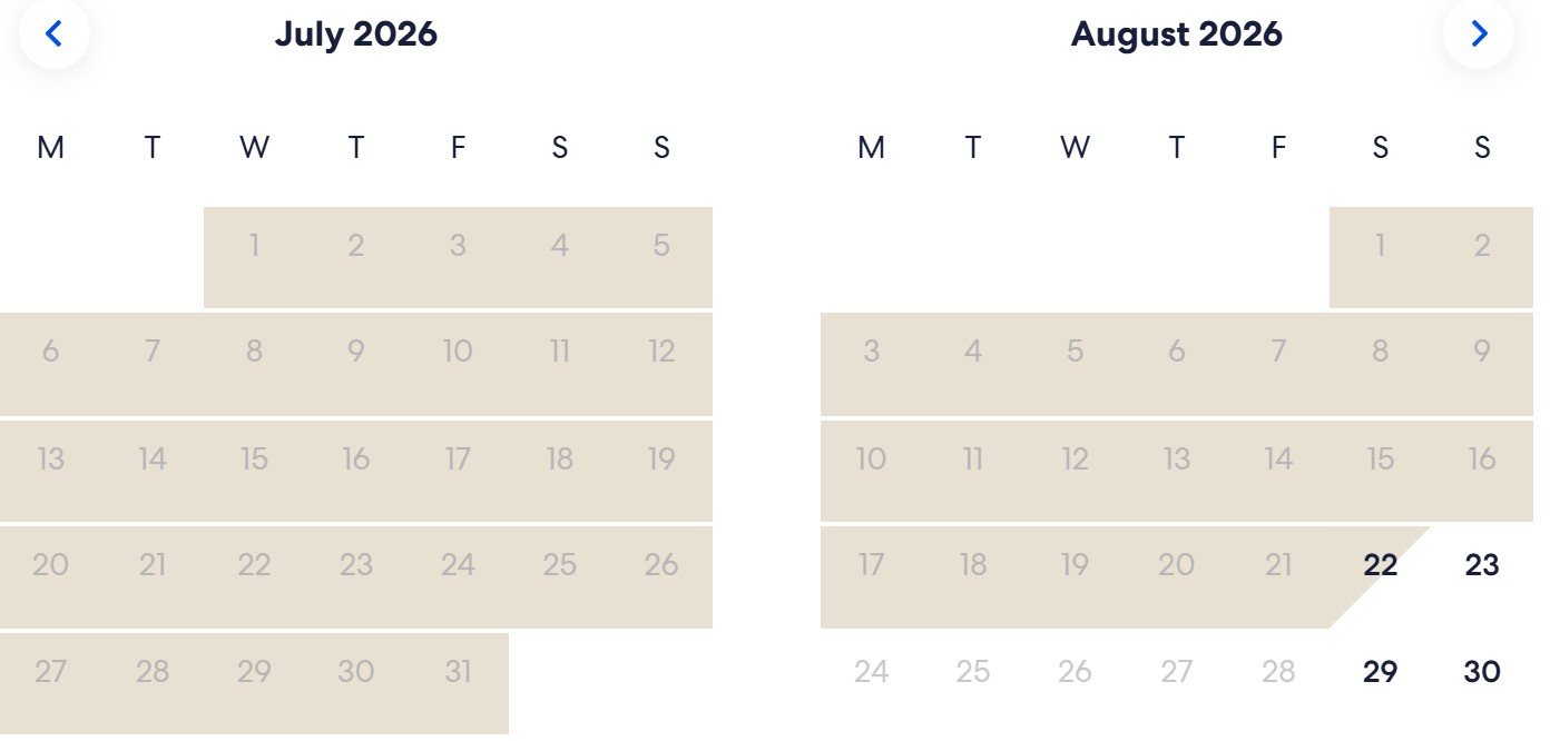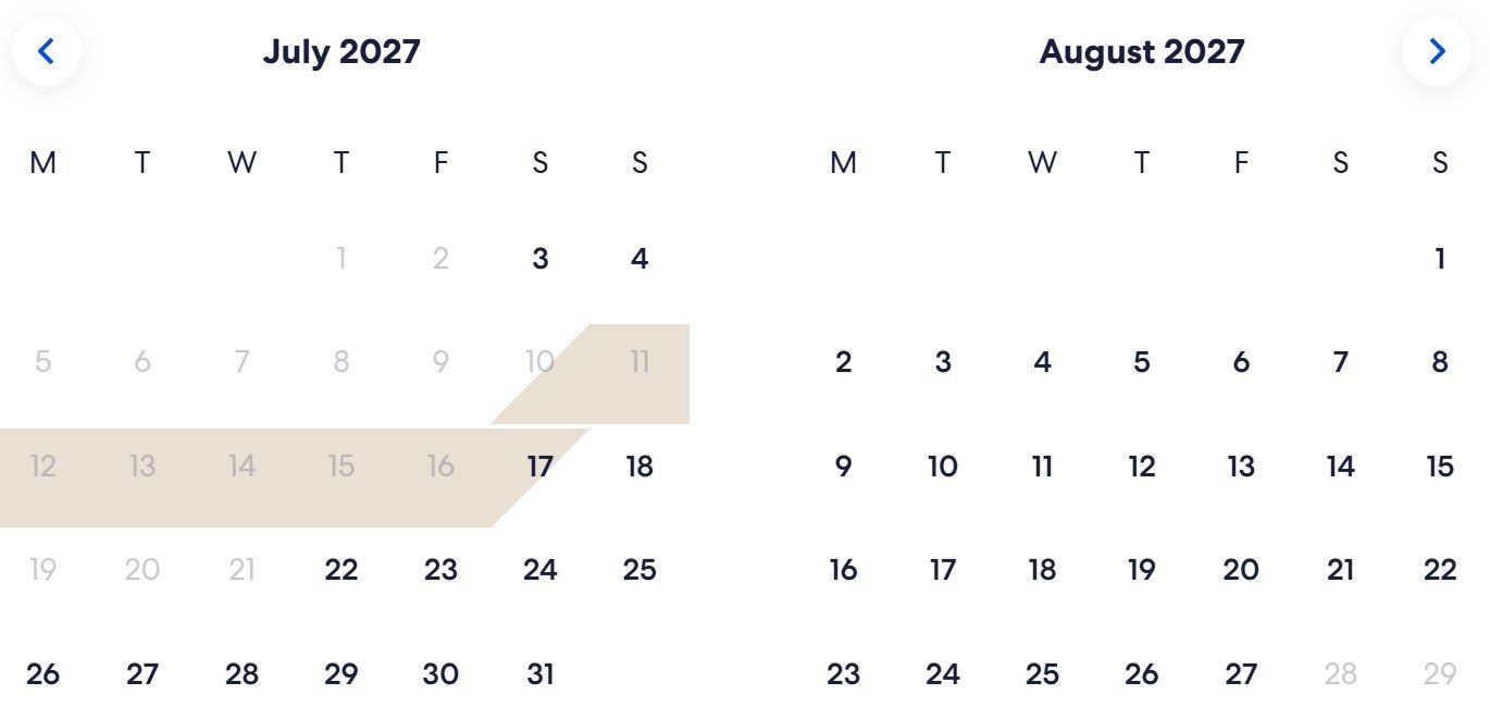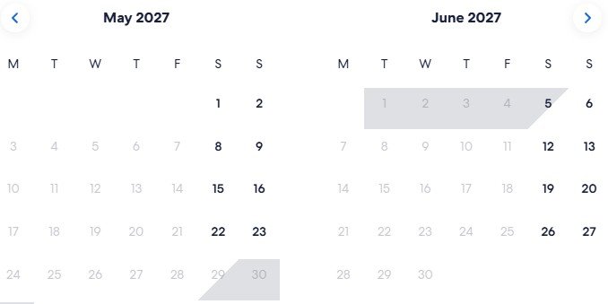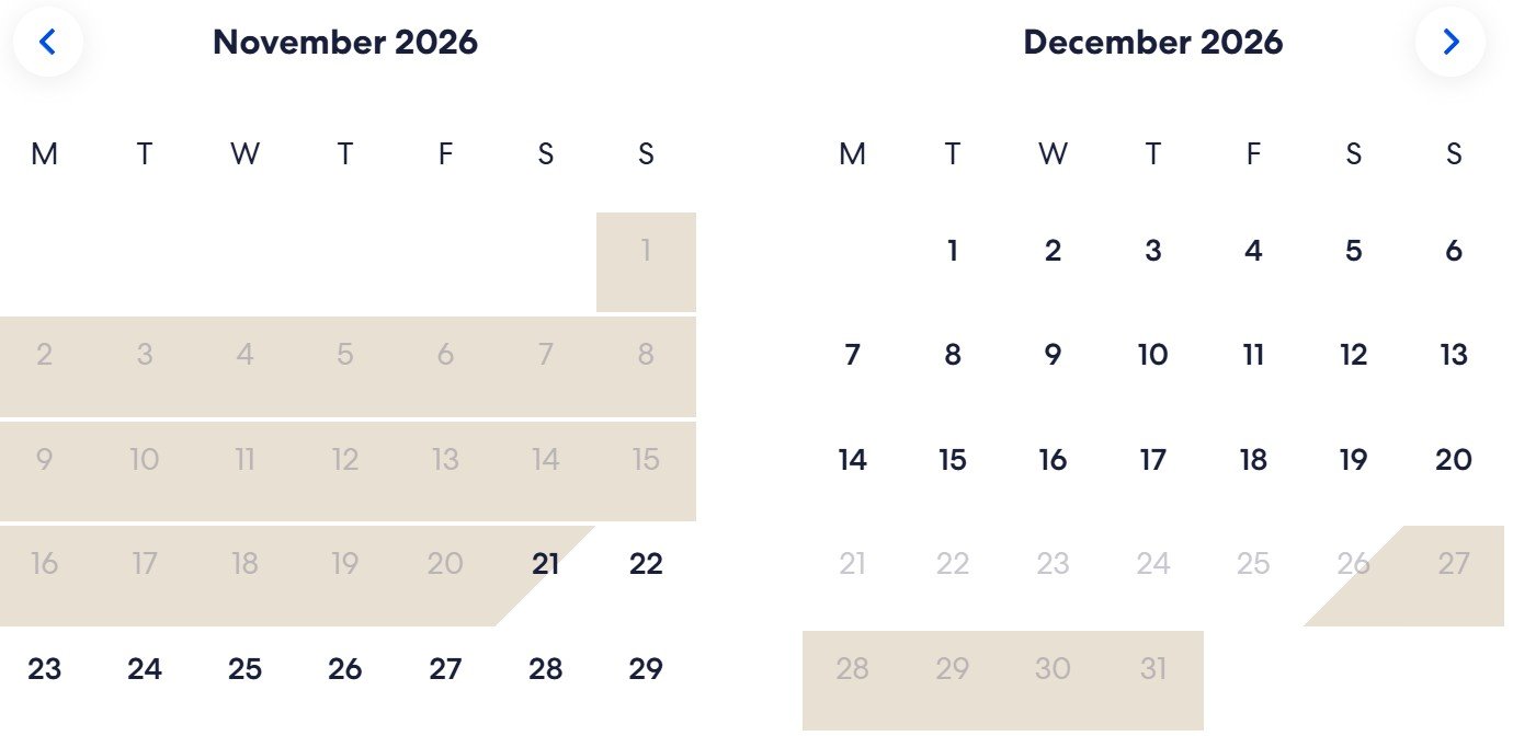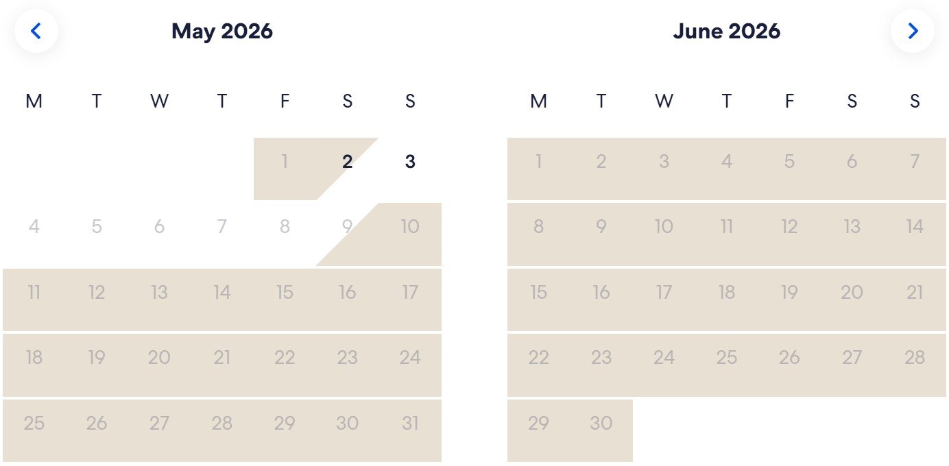 The calendar shows the currently available dates. The days highlighted with grey bars are already booked. Arrival is not possible on greyed-out days. This is due to the minimum rental period of 7 days in the high season from April to October and 5 days in the low season from November to March. It is not essential to book by the week. for example, 10 days would also be possible as long as there are no gaps in the booking. For different arrival or departure days, please simply send an enquiry using the booking form . We offer a discount of 10% for bookings of 2 weeks or more and 15% for bookings of 4 weeks or more.