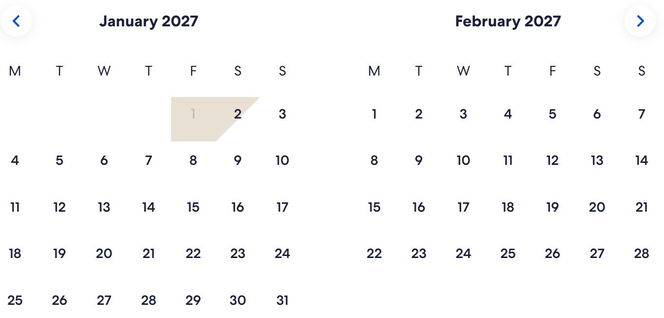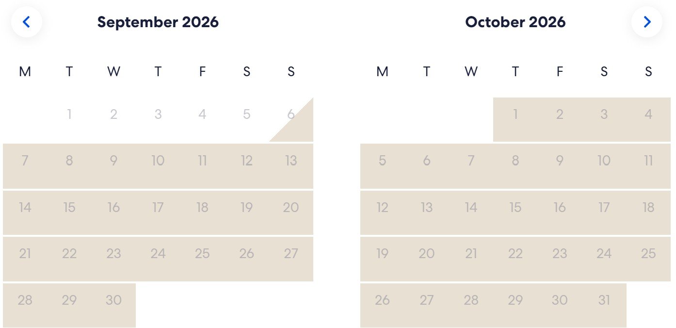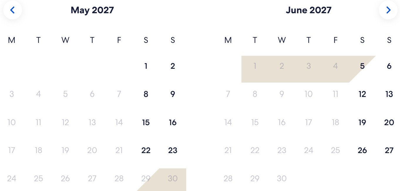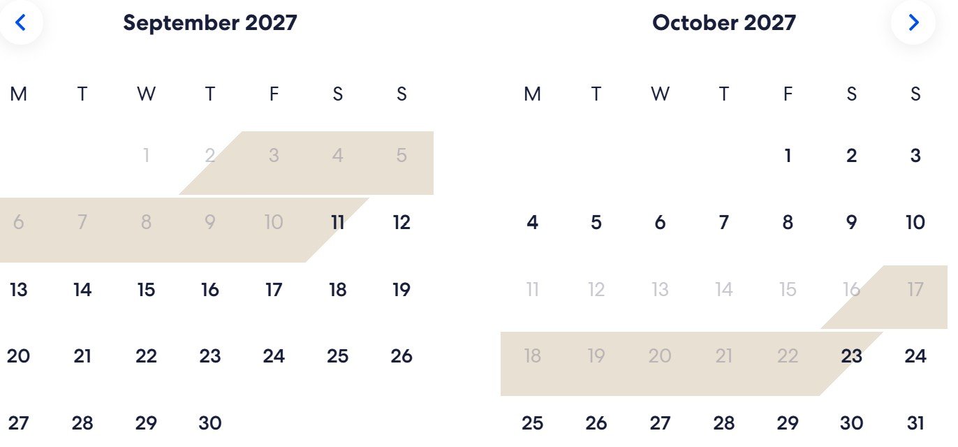 The calendar shows the currently available dates. The days highlighted with grey bars are already booked. Arrival is not possible on greyed-out days. This is due to the minimum rental period of 7 days in the high season from April to October and 5 days in the low season from November to March. It is not essential to book by the week. for example, 10 days would also be possible as long as there are no gaps in the booking. For different arrival or departure days, please simply send an enquiry using the booking form . We offer a discount of 10% for bookings of 2 weeks or more and 15% for bookings of 4 weeks or more.